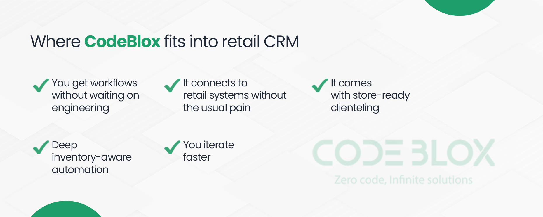 Retailers adopt CodeBlox because it solves the three hardest parts of CRM: