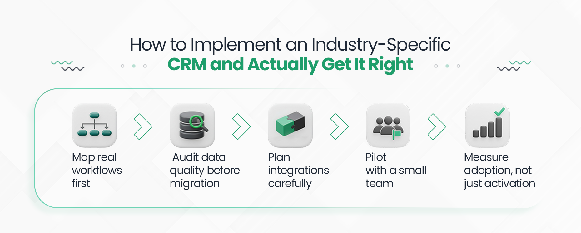 A generic CRM looks cheaper upfront, but configuration and maintenance costs add up. An industry-specific CRM costs more to start, but those hidden hours often close the gap faster than expected. Once you have picked your platform, the next step is getting the implementation right.